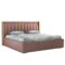 The bed features a soft upholstered headboard in elegant onion pink fabric, adding a modern designer touch while providing comfortable back support for reading, relaxing, or watching TV. The warm wood tone combined with the subtle pink upholstery creates a sophisticated focal point for contemporary bedrooms.